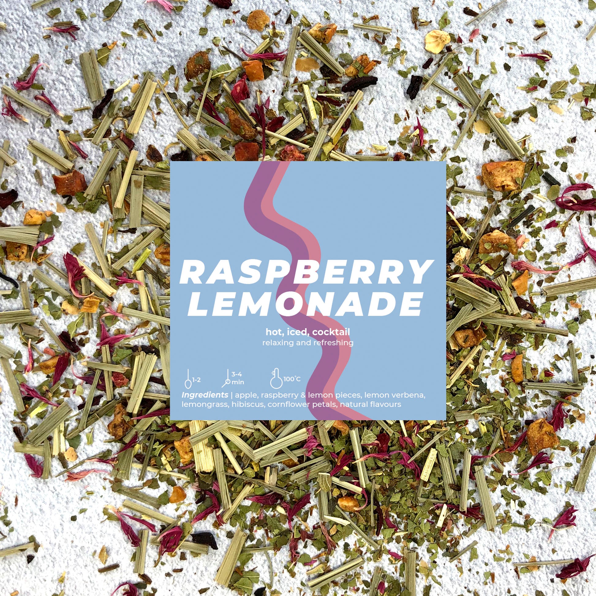 Apple pieces, lemon verbena, lemongrass, hibiscus, lemon peel, raspberry pieces, cornflower petals, natural flavours